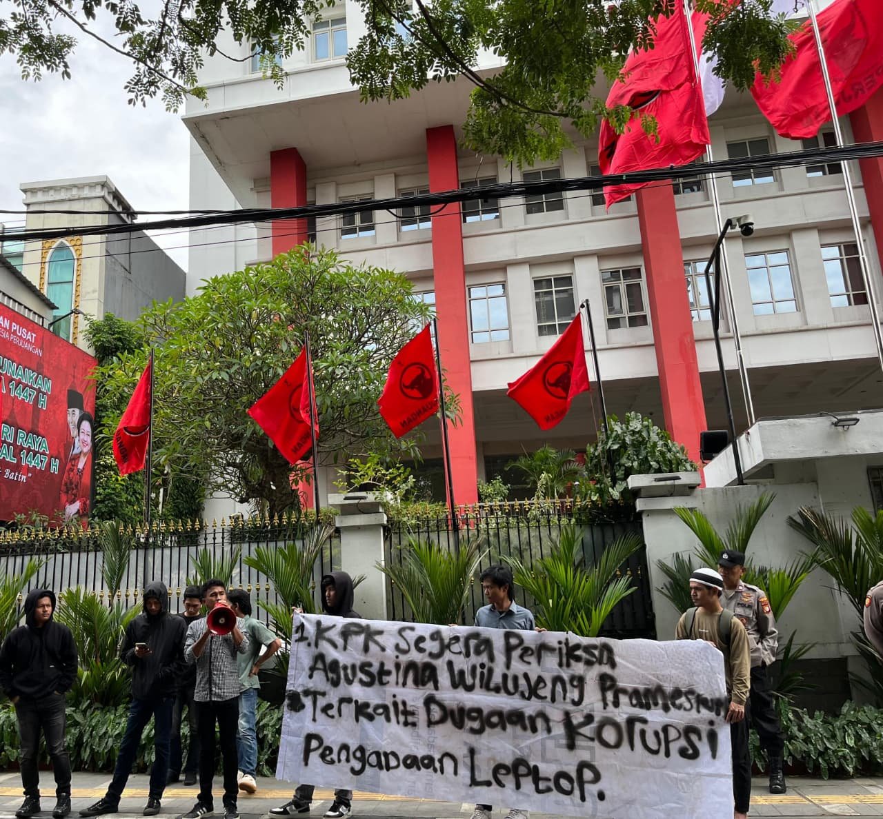 “Kasus ini adalah mega korupsi digitalisasi pendidikan. Uang rakyat triliunan rupiah diduga dikorupsi, dan nama Agustina Wilujeng Pramestuti muncul saat ia masih menjabat sebagai Wakil Ketua Komisi X DPR RI,” teriak salah satu demonstran dalam aksinya, Kamis (27/2).