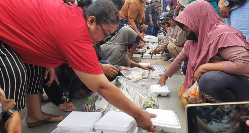 Ribuan warga Pati mengrumuni makanan yang telah disiapkan untuk syukuran di Alun-alun Simpang Lima Pati usai Bupati Pati Sudewo ditetapkan sebagai tersangka oleh KPK, Jumat (23/1/2026).(KOMPAS.com/ Kafi)
